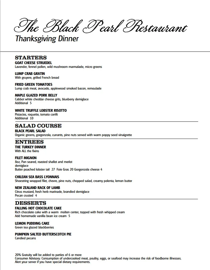 The Chef's favorite time of year is upon us! We have officially released our 2014 Thanksgiving menu! We will be offering a $70, 4 course menu with plenty of wonderful selections including an appetizer, salad, entree, and dessert! We will be open from 2pm - 9pm, space is limited so call (727)-734-DINE (3463) today to book your Thanksgiving Dinner! We look forward to hearing from you!